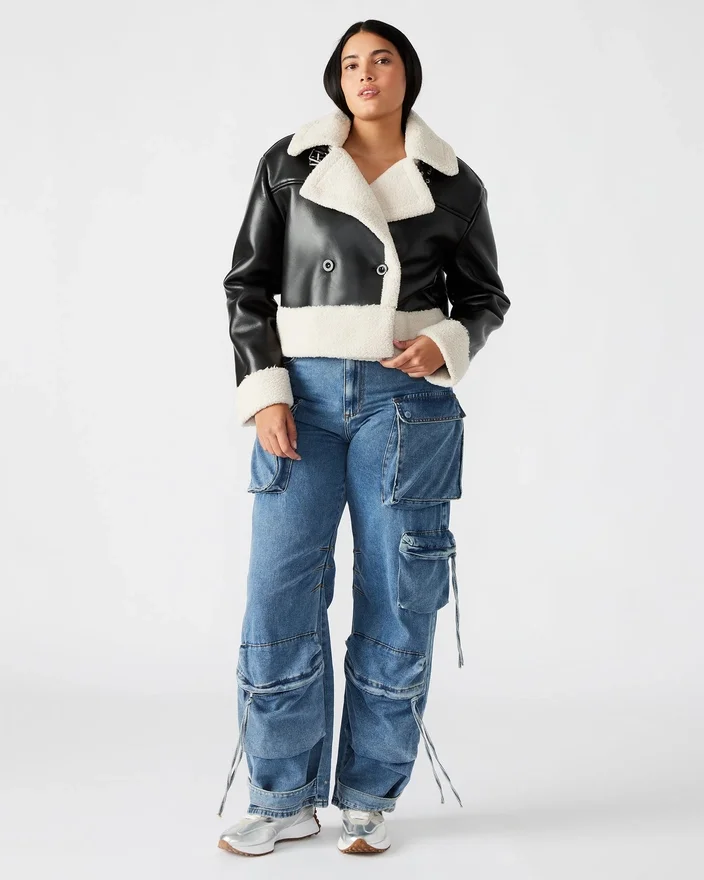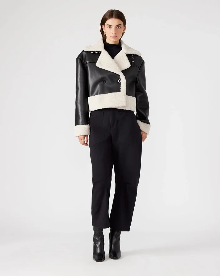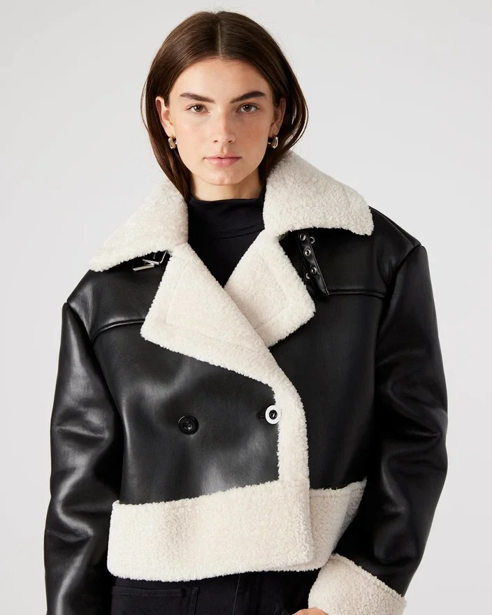 Die Athen-Jacke ist meisterhaft gefertigt und ein zeitloses Kleidungsstück, das sowohl Stil als auch Funktionalität bietet. Ihr Zweireiher-Design verleiht ihr einen eleganten Touch, während die kastenförmige Oversize-Passform und die verkürzte Länge für einen modernen Twist sorgen. Der Besatz aus Kunstlammfell sorgt nicht nur für Struktur, sondern auch für Wärme. Der praktische Kragenriemen und die stabilisierenden Knöpfe machen diese Jacke zu einer praktischen Wahl für jeden Anlass.