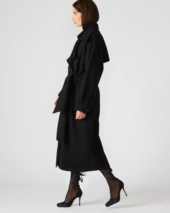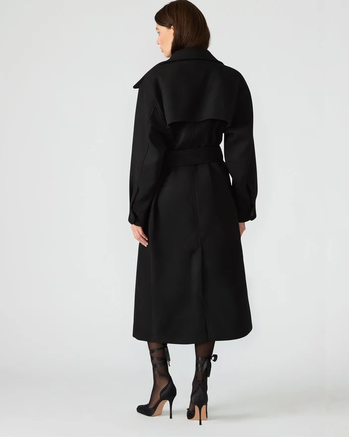 Der Enora Mantel Schwarz ist ein raffinierter Trenchcoat mit langen Ärmeln, Knopfleiste und klassischem Kragenausschnitt. Dieser Mantel wurde für strukturierte Eleganz und vielseitige Kombinierbarkeit entworfen und bietet sowohl zeitlosen Stil als auch praktischen Schutz. Seine taillierte Silhouette und die raffinierten Details machen ihn zu einem unverzichtbaren Teil für eine gepflegte, professionelle Garderobe.