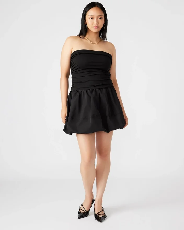 Dieses Amari-Minikleid besticht durch ein Oberteil aus Stretch-Strick und einen Rock mit ausgestellter Säume, die sowohl Komfort als auch Stil bieten. Der seitliche Reißverschluss und der Gummizug sorgen für einen sicheren Sitz, während das vollständig gefütterte, trägerlose Design und das geraffte Oberteil an den Seitennähten einen Hauch von Eleganz verleihen. Mit seiner leicht tiefer sitzenden Taille ist es perfekt für jeden Anlass.