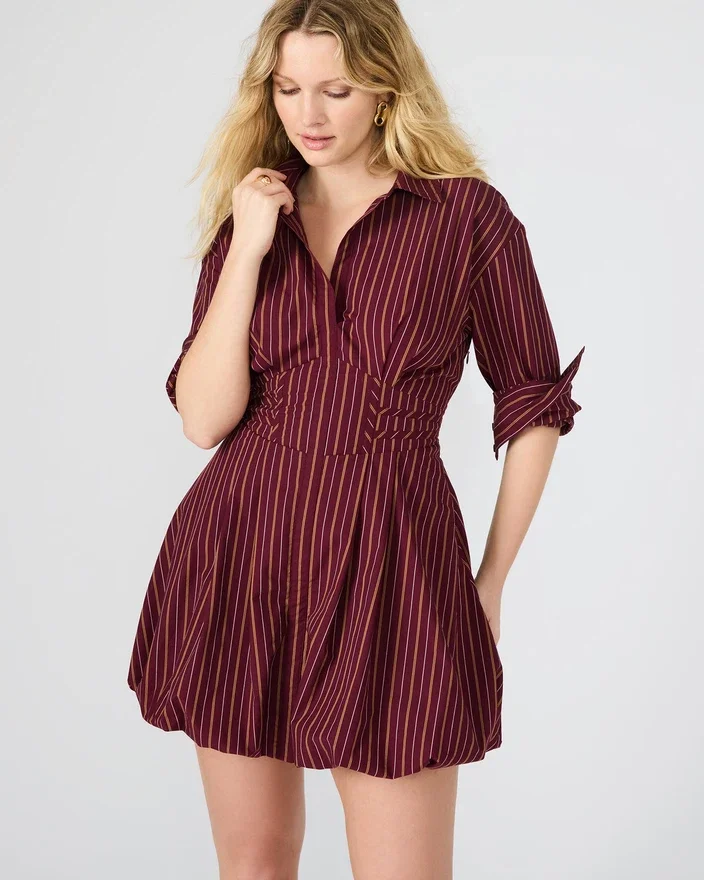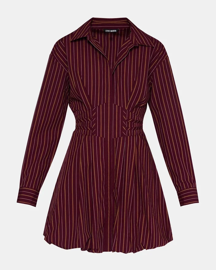 Das Arielle-Kleid ist eine raffinierte Interpretation des klassischen langärmeligen Knopfkleids. Seine taillierte Passform und der satte Weinrot-Farbton sorgen für eine elegante Silhouette, ideal für berufliche Anlässe oder elegante Veranstaltungen.