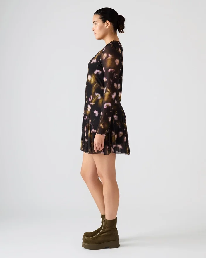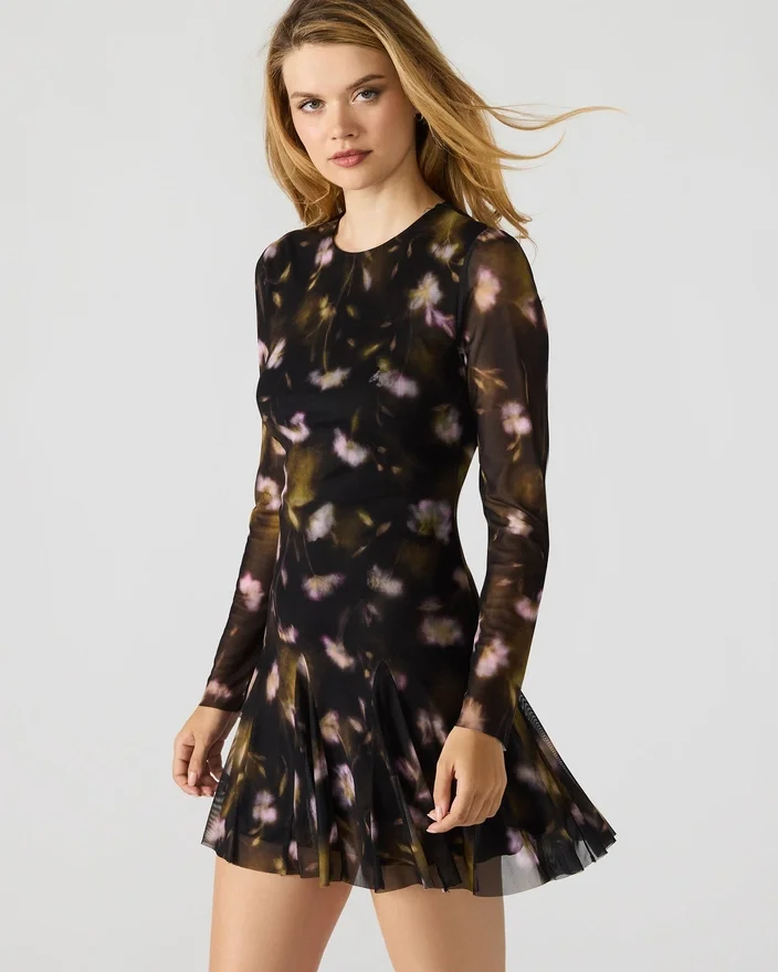 Werten Sie Ihre Garderobe mit dem Bliss-Kleid in Schwarz mit zierlichem Blumenmuster auf. Es besticht durch eine schmeichelhafte Minilänge und eine fließende Silhouette, die sich mühelos bewegt. Dieses Kleid verfügt über zarte, transparente Mesh-Langärmel, die ihm einen subtilen, modernen Touch verleihen, während der aufwendige schwarze Blumenprint zeitlosen, femininen Charme versprüht.