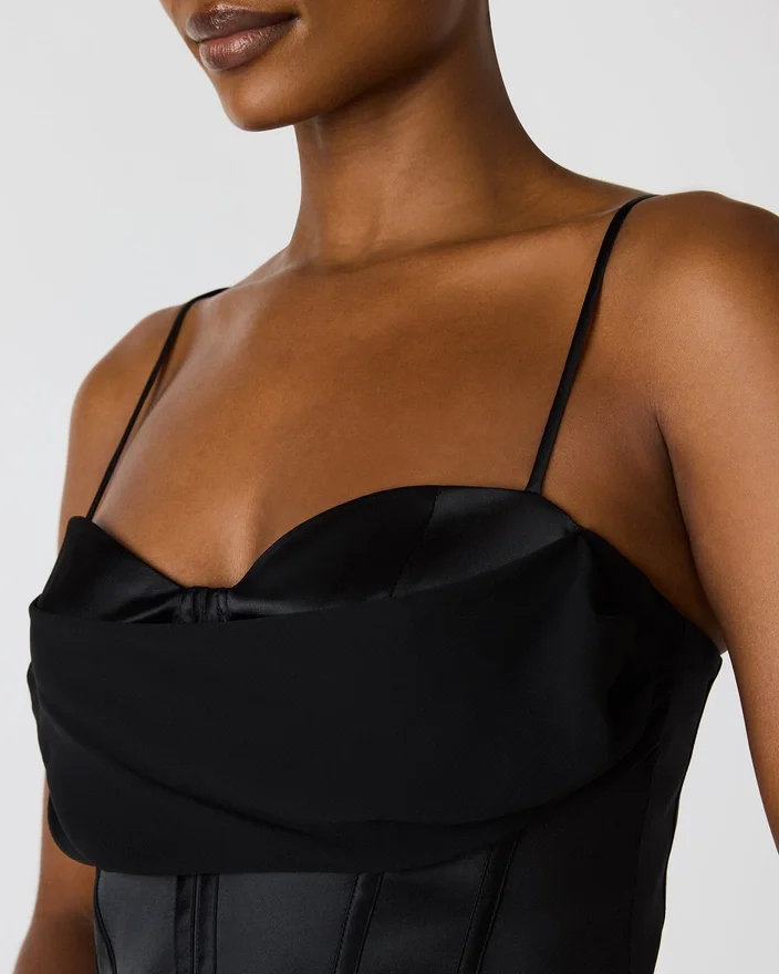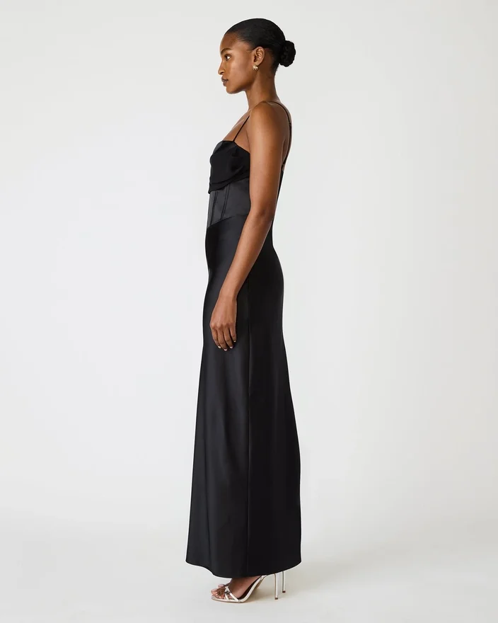 Das schwarze Carmela-Kleid verbindet zeitlose Eleganz mit moderner Raffinesse. Dieses Maxikleid aus luxuriösem Satinstoff verfügt über ein strukturiertes Bustier-Oberteil, das für schmeichelhaften Halt und eine schöne Silhouette sorgt. Verstellbare Träger ermöglichen eine individuelle Passform, während der praktische Reißverschluss am Rücken ein müheloses Anziehen gewährleistet.