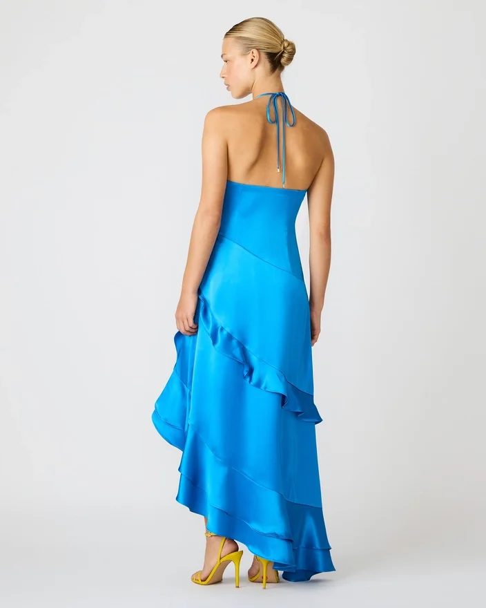 Das Caspia-Kleid in Blau besticht durch eine raffinierte Silhouette mit hohem Ausschnitt und fließender Maxilänge. Dieses auffällige Kleidungsstück präsentiert sich in einem asymmetrischen Design, das durch Rüschen ergänzt wird, die für Bewegung und Dimension sorgen. Ein praktischer seitlicher Reißverschluss sorgt für eine bequeme Passform, ohne die eleganten Linien des Kleides zu beeinträchtigen. Perfekt, um bei jedem Anlass ein markantes Statement zu setzen.