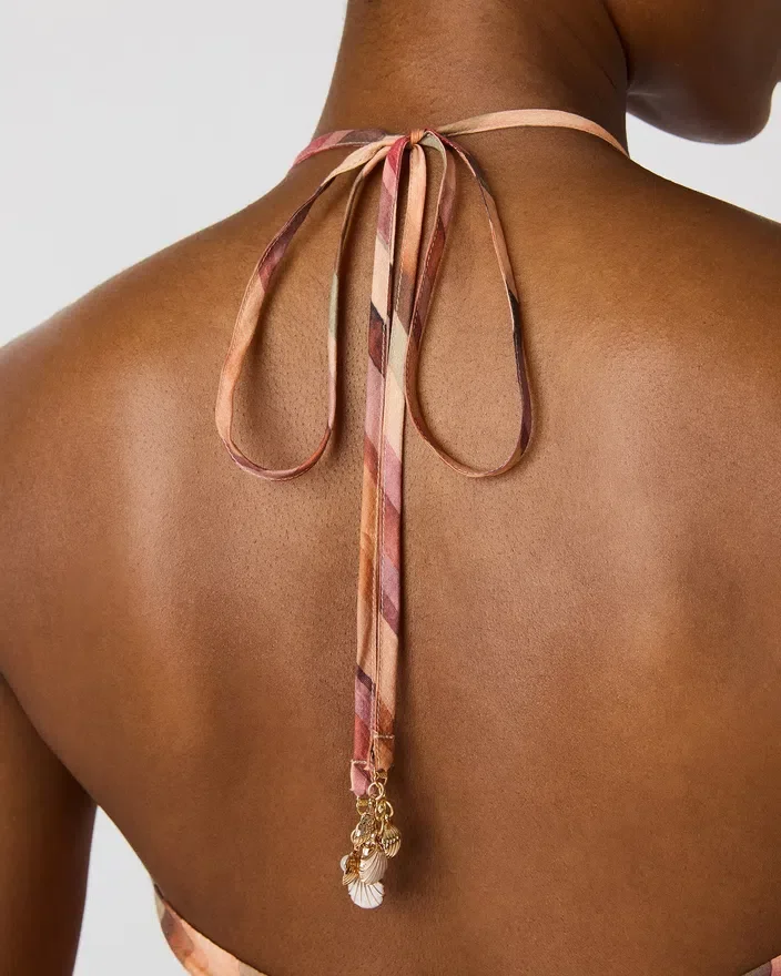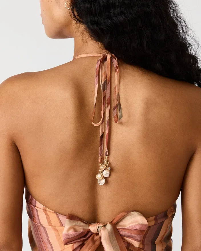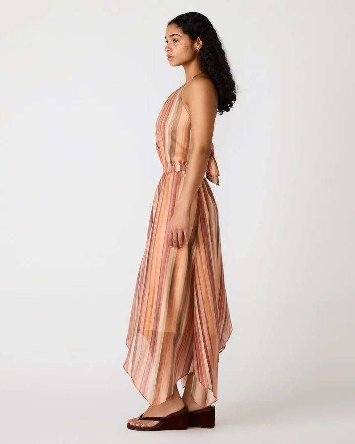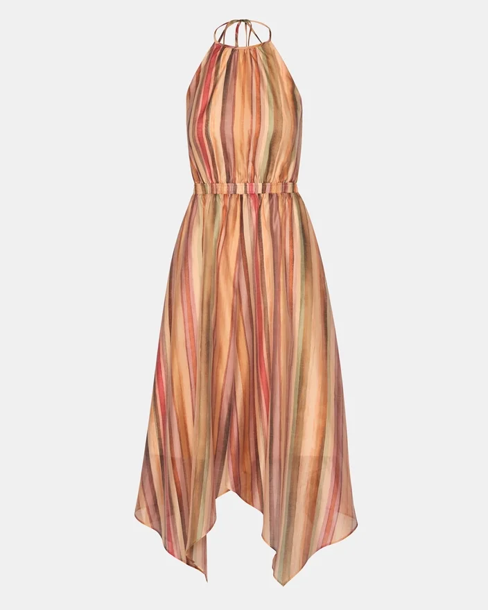 Das Dalina-Kleid Stripe Multi verfügt über einen anmutigen Neckholder-Ausschnitt, der die Schultern elegant umrahmt und gleichzeitig vielseitige Styling-Möglichkeiten bietet. Vertikale Streifendetails in einer bunten Farbpalette verleihen der Silhouette optische Spannung und Bewegung.