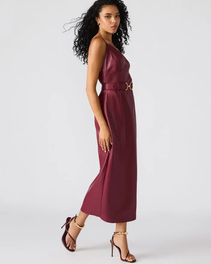 Dieses Kailey Cordovan Midi-Kleid aus Kunstleder verfügt über verstellbare Träger für eine individuelle Passform und einen Reißverschluss am Rücken für einfachen Tragekomfort. Sein elegantes Finish sorgt für einen raffinierten, modernen Look, der sich ideal für Tages- und Abendanlässe eignet. Das ärmellose Design erhöht die Vielseitigkeit und macht es zu einer stilvollen Wahl, sowohl zum Kombinieren als auch zum alleinigen Tragen.