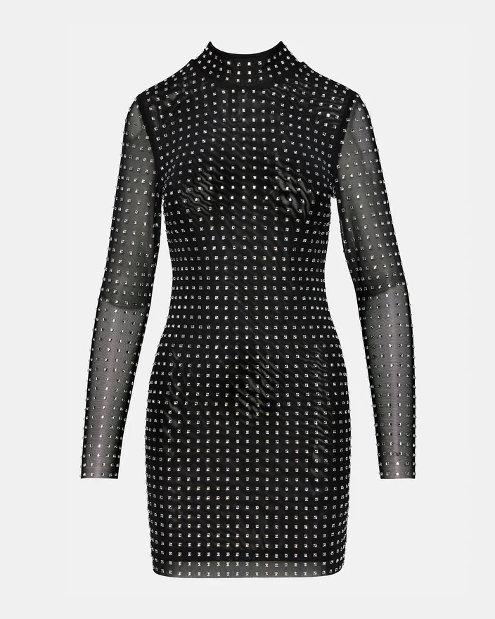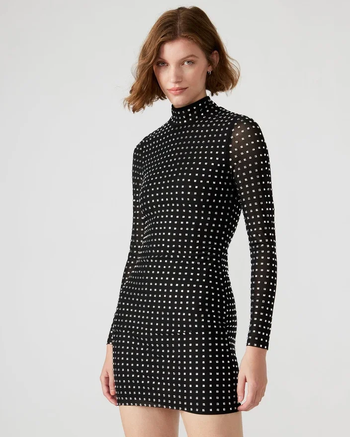 Verleihen Sie Ihrem Stil das gewisse Etwas mit unserem Krista-Kleid. Dieses langärmelige Minikleid verfügt über einen Stehkragen und einen Reißverschluss am Rücken. Dieses atemberaubende Kleid ist zudem mit einzigartigen, quadratischen Strass-Nieten verziert, die für einen Hauch von Glamour sorgen. Setzen Sie ein Statement mit diesem eleganten und raffinierten Kleidungsstück, das sich perfekt für jeden Anlass eignet.