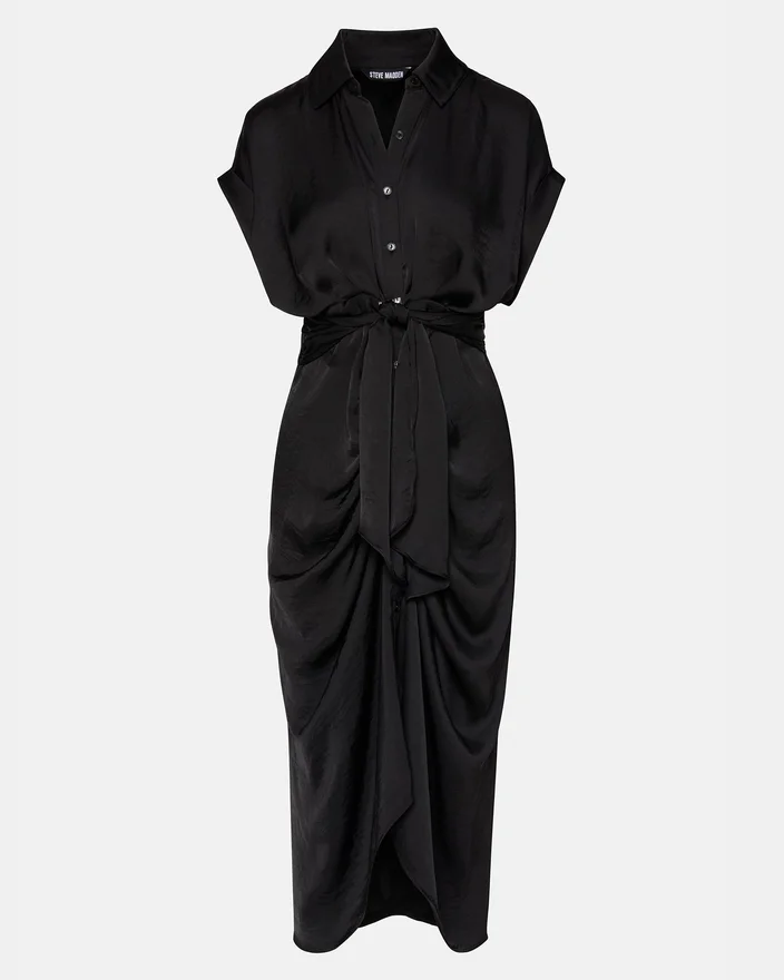 Das Tori-Kleid hat einen Rollkragen und kurze Ärmel mit Manschetten, einen verstellbaren, gerafften Bindegürtel vorne und einen High-Low-Saum. Das Kleid ist mit einer gewaschenen Satinstruktur versehen, die ihm einen eleganten Look verleiht.