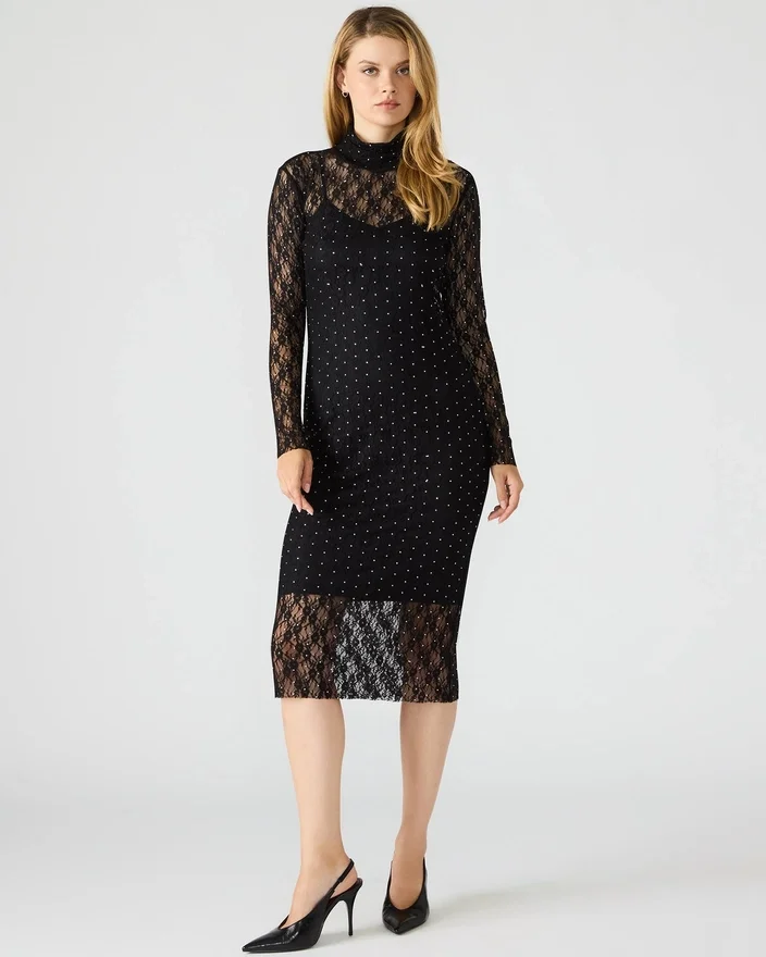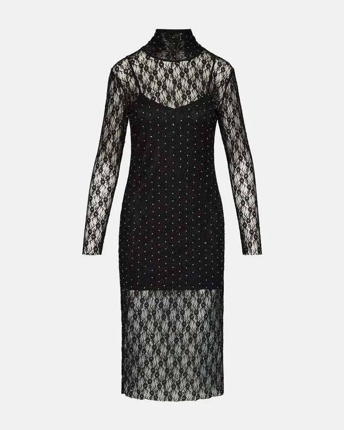 Das schwarze Vivienne-Spitzenkleid mit Nieten verfügt über eine gefütterte, mittellange, transparente Mesh-Außenlage mit Stehkragen und Daumenlöchern an den Ärmeln.