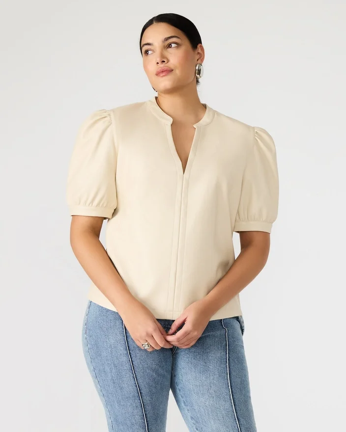 Das Jane Top besticht durch ein zeitgemäßes Design mit einem Hauch von Feminität. Sein weicher Kunstlederstoff verleiht dem Pullover-Modell mit kurzen Puffärmeln Struktur. Der geteilte V-Ausschnitt und die halbhohen Puffärmel runden den eleganten und raffinierten Look ab.