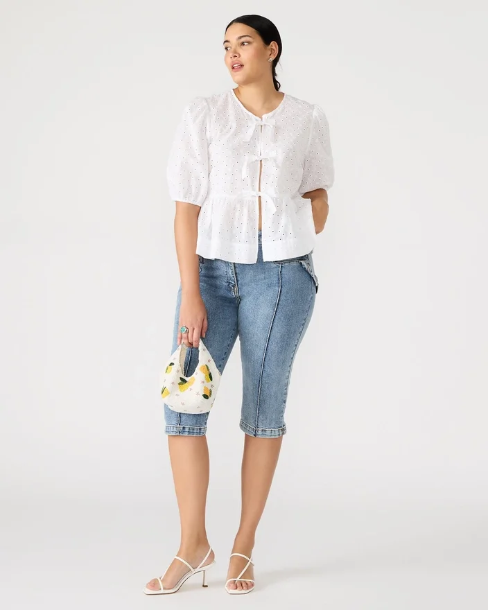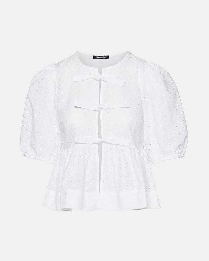 Das Paula-Top besticht durch stilvolle, kurzärmelige Puffärmel und einen Bindegürtel vorne, akzentuiert durch zarte Lochstickereien. Dieses Top bietet einen schicken, modernen Look, perfekt für jeden Anlass.
