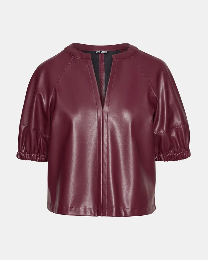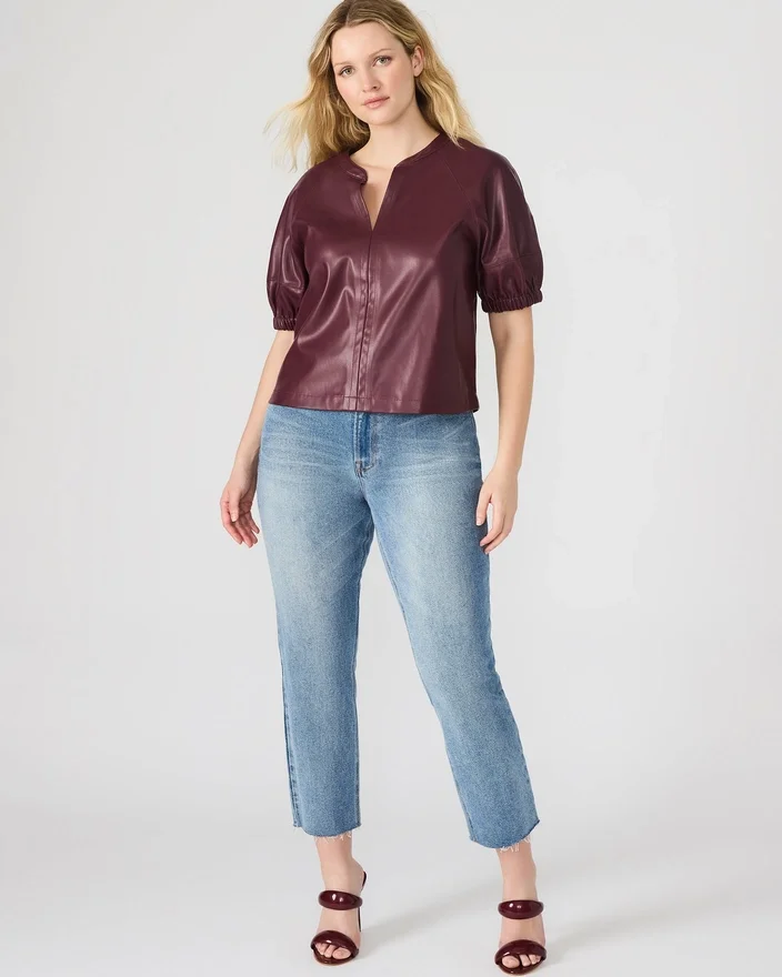 Werten Sie Ihre Garderobe mit dem Roxanne-Top auf, das sich durch kurze Puffärmel aus luxuriösem Kunstleder auszeichnet. Dieses meisterhaft entworfene Kleidungsstück kombiniert eine ausgefallene Textur mit einer schmeichelhaften Silhouette und eignet sich perfekt, um in jeder Umgebung einen raffinierten Eindruck zu hinterlassen.