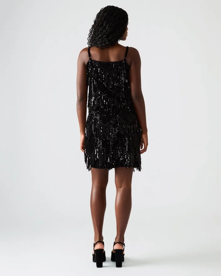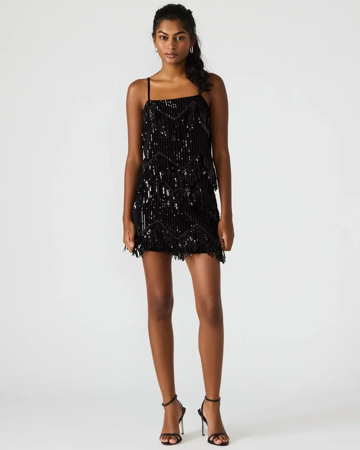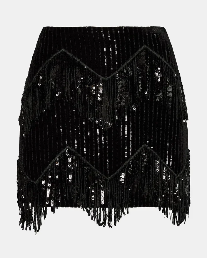 Verleihen Sie Ihrem Abendlook das gewisse Etwas mit dem Cindi Paillettenrock in Schwarz. Dieser Rock besticht durch schimmernde Paillettenverzierungen, die mit dynamischen Fransen kombiniert sind und Ihrem Look Bewegung und einen auffälligen Akzent verleihen. Als Teil eines passenden Sets entworfen, bietet er ein aufeinander abgestimmtes, modisches Ensemble, das sich perfekt für besondere Anlässe oder Ausgehabende eignet. Die luxuriöse Verarbeitung und die fließenden Fransen des Rocks sorgen für einen auffälligen Look, während er gleichzeitig bequem zu tragen ist.