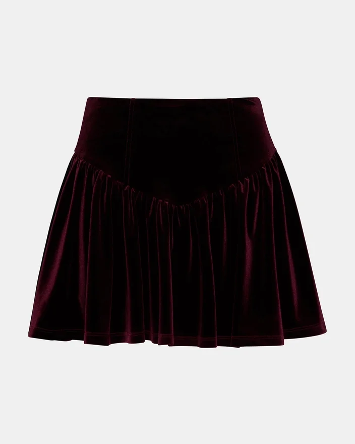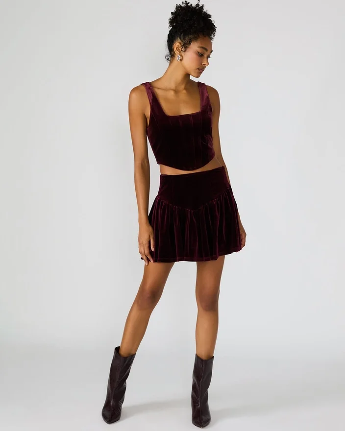Werten Sie Ihre Garderobe mit dem Jayla Rock Wein auf, einem fließenden Minirock aus Samt, der für mühelose Eleganz entworfen wurde. Dieses Teil lässt sich nahtlos mit dem passenden Set kombinieren und bietet einen harmonischen und luxuriösen Look, der perfekt für besondere Anlässe oder stilvolle Alltagskleidung ist. Der Samtstoff sorgt für eine edle Textur und einen dezenten Schimmer, während die schmeichelhafte Silhouette Bewegungsfreiheit und Tragekomfort bietet. Ideal für alle, die eine raffinierte und zugleich verspielte Ergänzung für ihre Garderobe suchen.