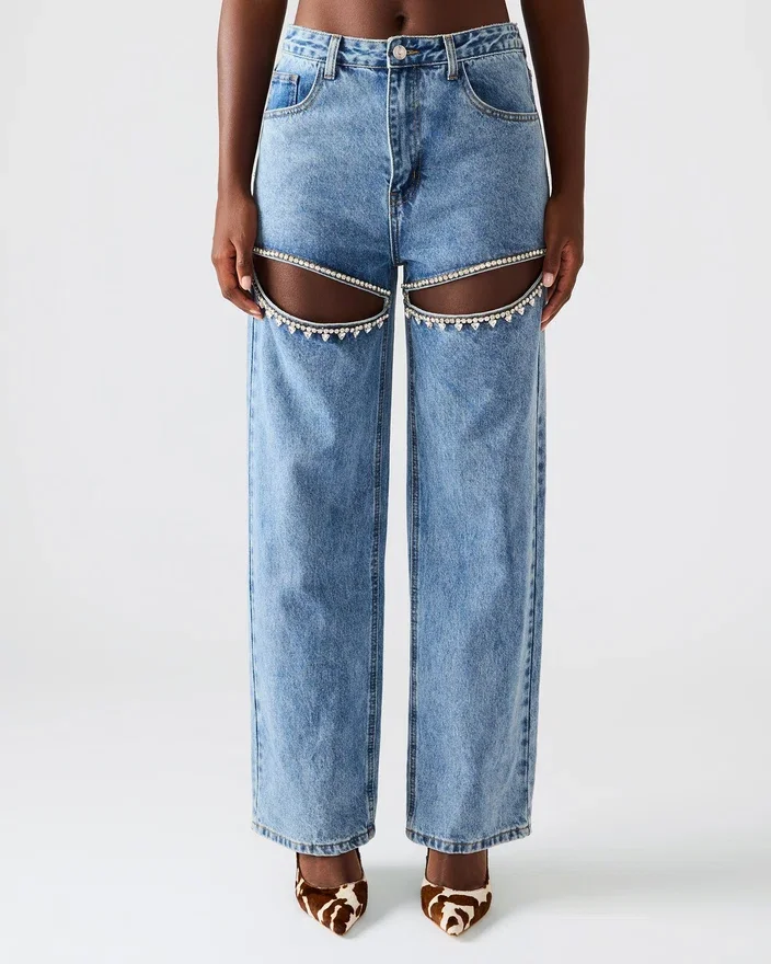 Die Taylor-Jeans bietet eine stilvolle Variante eines klassischen Designs. Mit ihrer weiten Passform sorgt diese Jeans für Komfort und Vielseitigkeit, während die aufwendigen Strassverzierungen an den Oberschenkeln einen Hauch von Glamour verleihen.