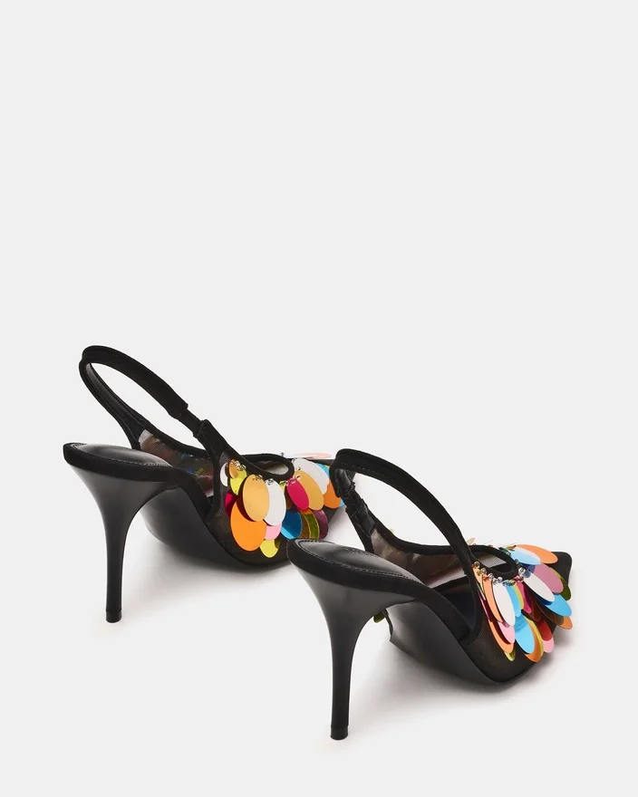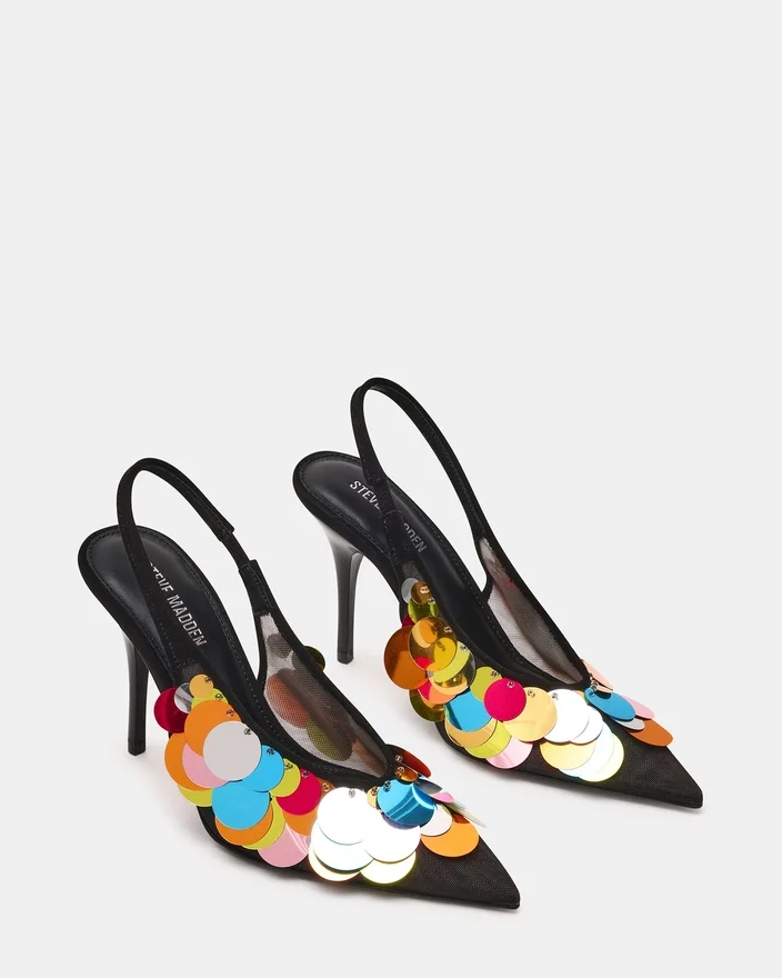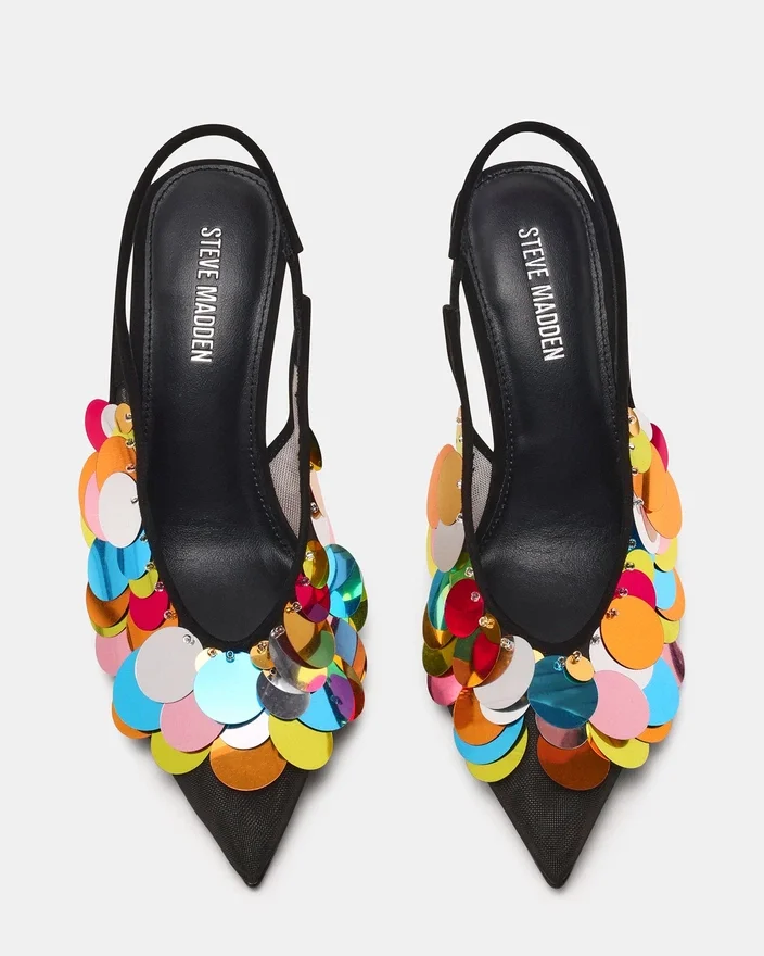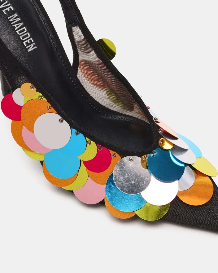 Der Avid Black Mesh-Pumps kombiniert leuchtende, mehrfarbige Pailletten mit atmungsaktivem Mesh und schafft so einen auffälligen optischen Kontrast. Sein spitz zulaufendes Zehen-Design sorgt für eine schlanke, elegante Silhouette, während der Slingpump einen sicheren und bequemen Sitz gewährleistet. Dieser High Heel vereint Stil und Raffinesse perfekt und verleiht jedem Outfit einen unverwechselbaren Touch.