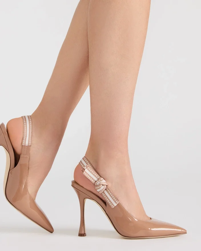 Ein Ripsband umwickelt den Fersenriemen des Bri-Slingpumps mit spitzer Zehenpartie und Stöckelabsatz und endet in einer Schleife, die die Seite des Schuhs betont.