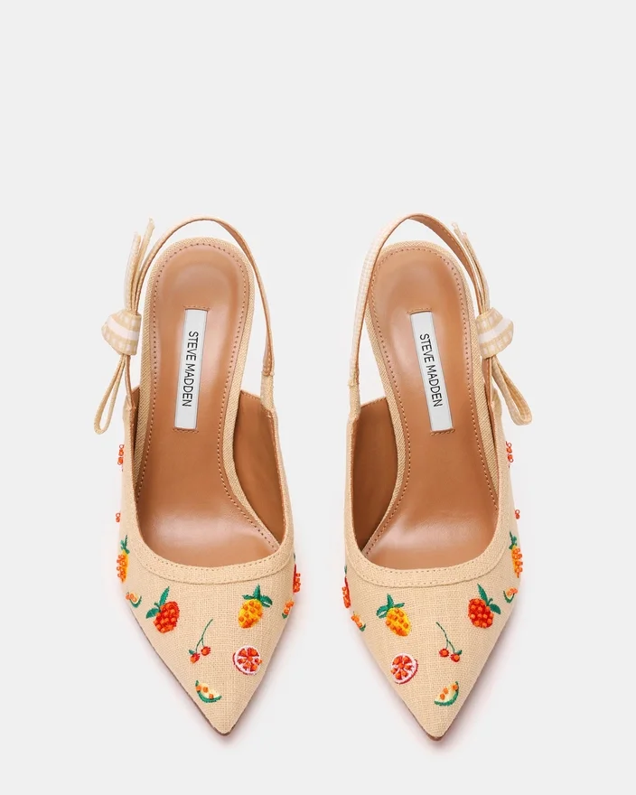 Ein Ripsband umwickelt den Fersenriemen des Bri Raffia Fruit Multi Stiletto-Pumps mit spitzer Zehenpartie und endet in einer Schleife, die die Seite des Schuhs ziert.