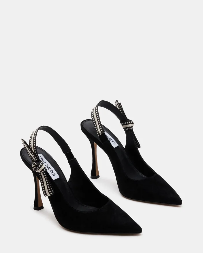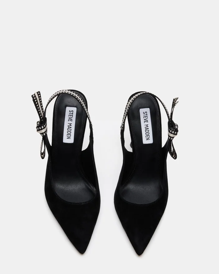 Ein Ripsband umschlingt den Fersenriemen des Bri-Slingpumps mit spitzer Zehenpartie und Stöckelabsatz und endet in einer Schleife, die die Seite des Schuhs ziert.