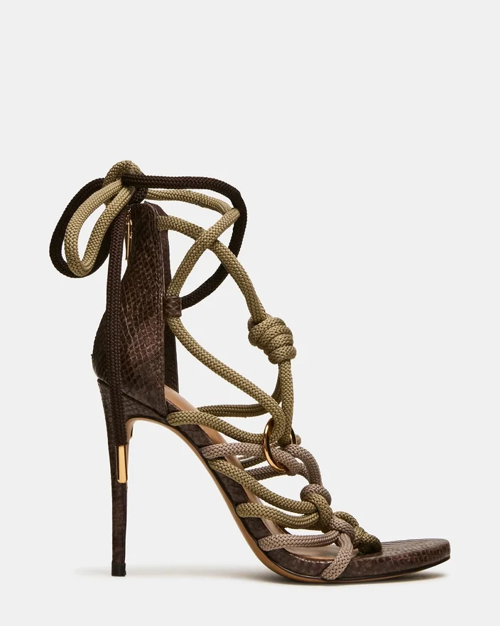 Der Catnyss Olive besticht durch einen markanten Stiletto-Absatz, der durch aufwendige Seil- und Knotendetails, die sich um das Bein wickeln, noch hervorgehoben wird. Dieses architektonische Design verwandelt eine klassische Silhouette in ein Statement-Stück und verbindet raffinierte Handwerkskunst mit auffälligen optischen Akzenten. Die Bindekonstruktion am Bein sorgt für eine individuelle Passform und verleiht dem Schuh gleichzeitig einen besonderen Touch. Perfekt für alle, die Schuhe schätzen, die Eleganz mit unverwechselbaren Designelementen verbinden.