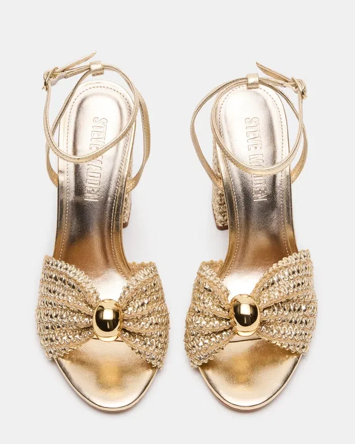Die Cheyla Gold Sandale verfügt über einen stilvollen Raffia-Absatz, kombiniert mit einem stabilen Blockabsatz für ganztägigen Tragekomfort. Abgerundet durch einen sicheren Fesselriemen bietet diese Sandale sowohl Mode als auch Funktionalität. Werten Sie Ihre Sommergarderobe mit diesem vielseitigen und schicken Schuh auf.