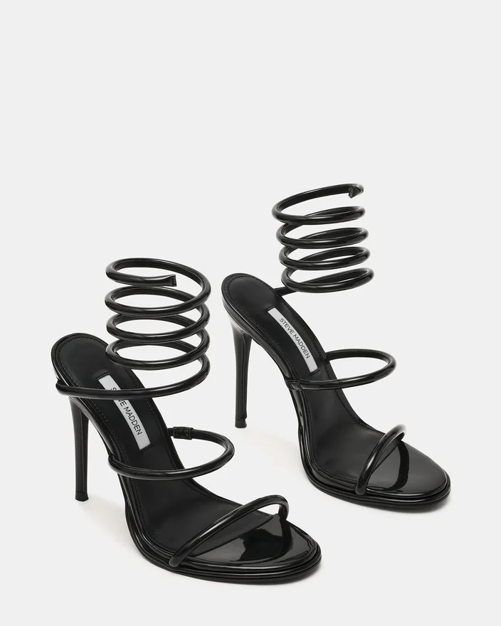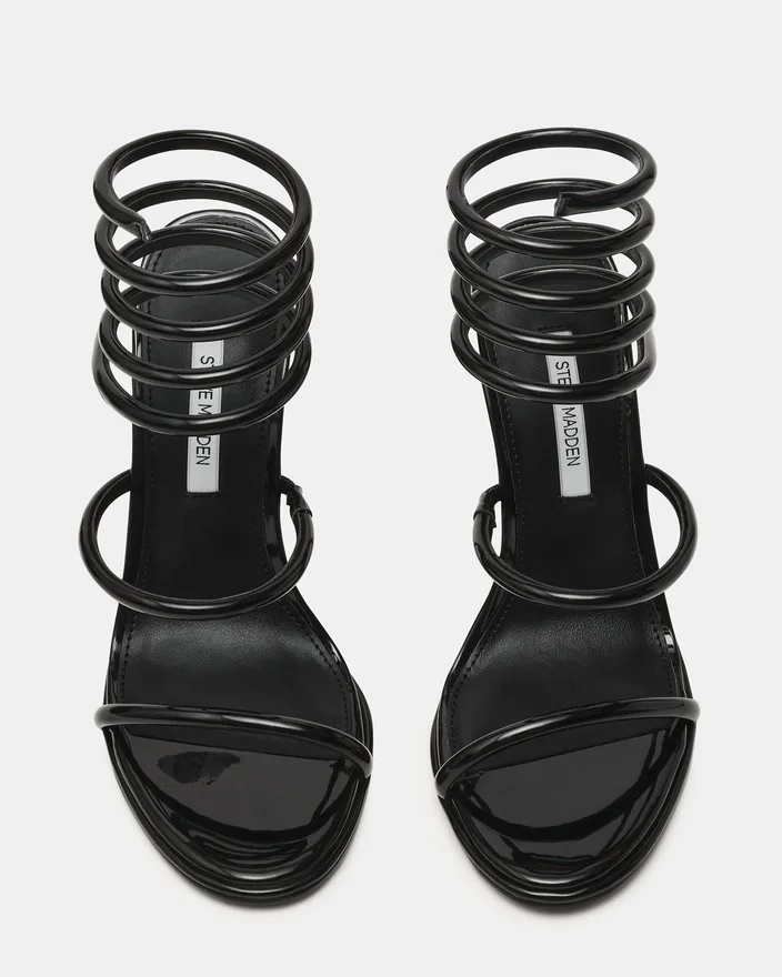 Verleihen Sie Ihrer Garderobe einen Hauch von Luxus mit Exotica Black Patent. Diese Stiletto-Sandale mit einem um das Bein gewickelten Riemen sorgt für einen einzigartigen Look und ein einzigartiges Tragegefühl, das in jeder Menschenmenge auffällt.