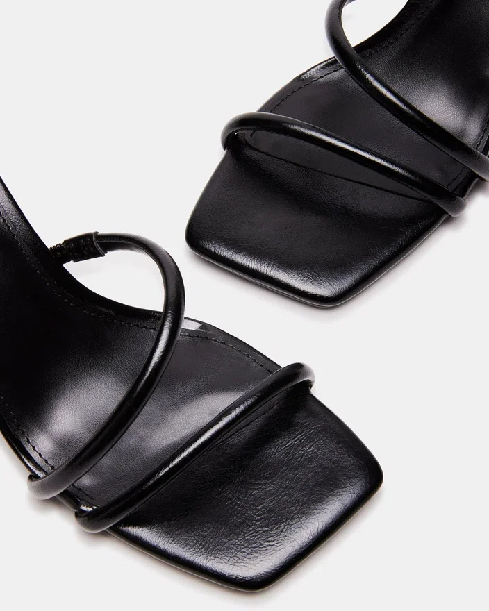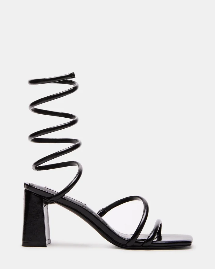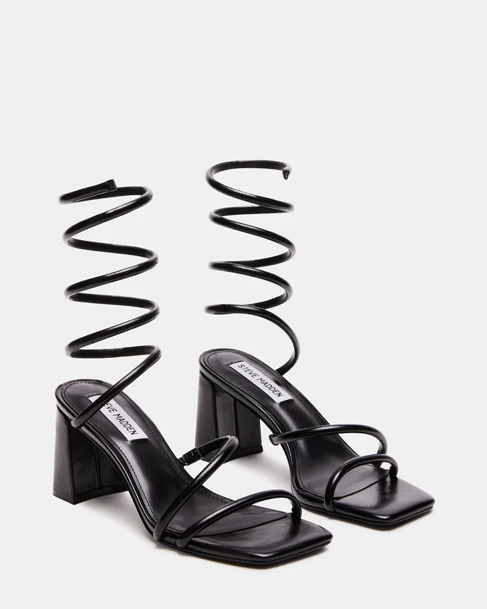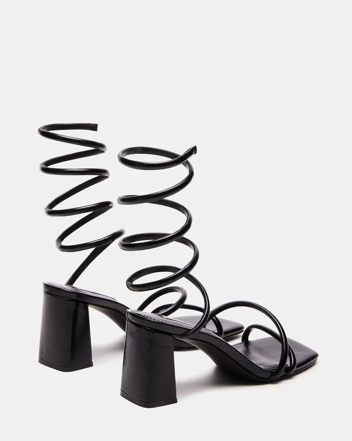 Dreidimensionale, röhrenförmige Riemen, die sich über den Fuß kreuzen und um den Knöchel wickeln, befestigen die Lopez-Sandalen an einer Sohle mit eckiger Zehenpartie und Blockabsatz.