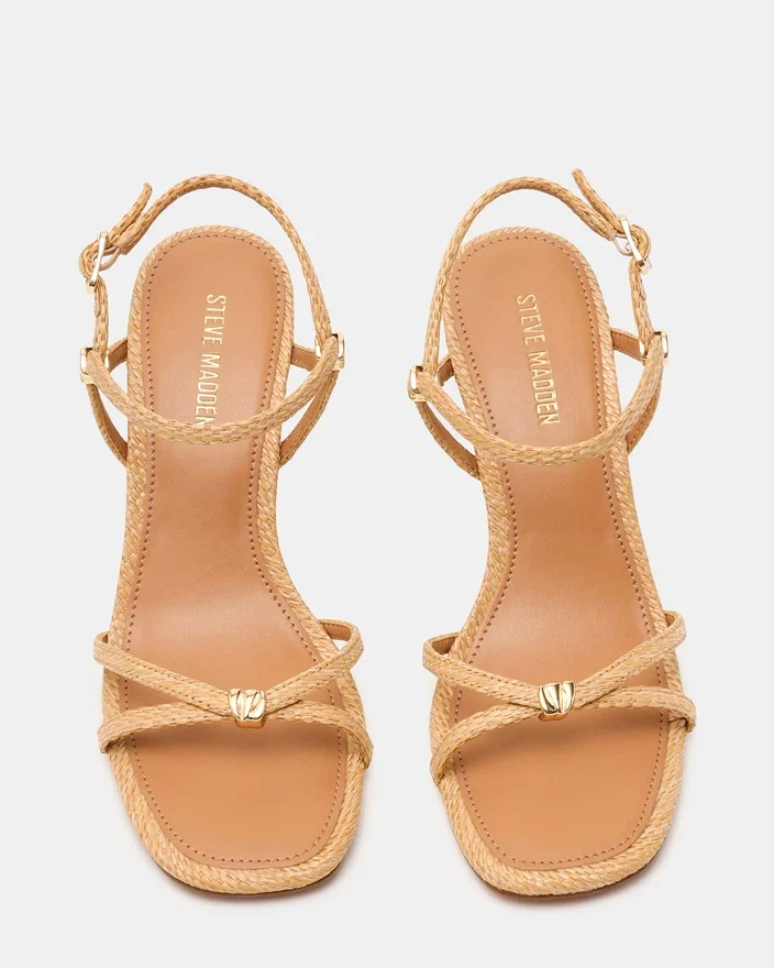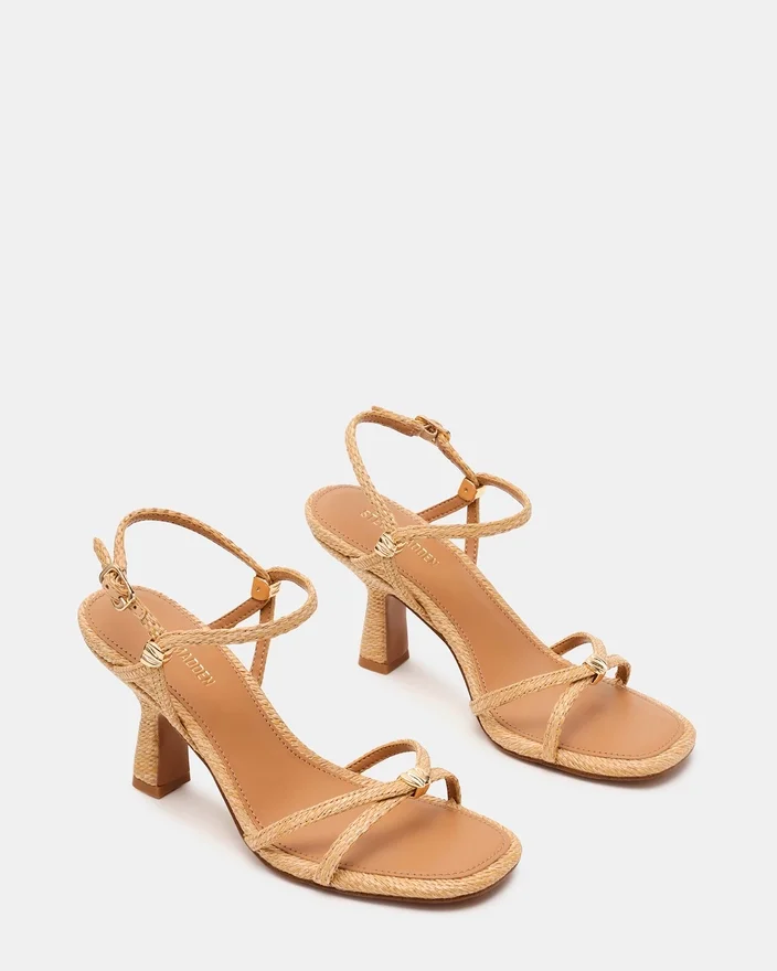 Der Posy Raffia wertet mit seiner raffinierten Silhouette jede Garderobe auf. Zarte goldene Details verleihen dem schlanken High Heel einen Hauch von Luxus, während das Riemchen-Design für sicheren Halt und optische Akzente sorgt. Die eckige Zehenform bietet ein modernes, schmeichelhaftes Profil, das sich nahtlos vom Tag bis in den Abend tragen lässt.
