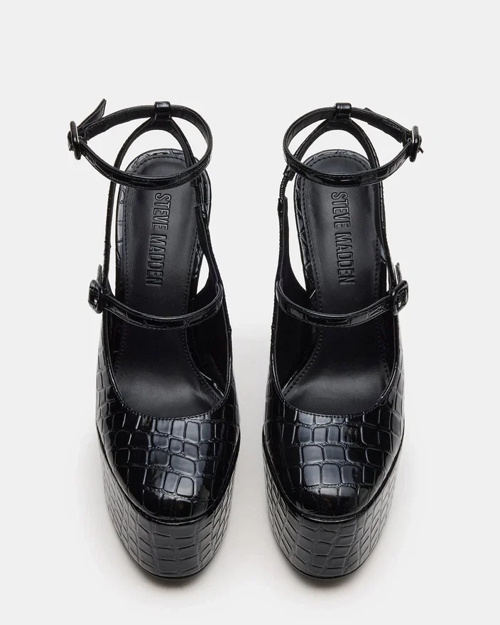 Verleihen Sie Ihrem Stil mehr Eleganz mit den Scotlyn Black Crocodile High Heels. Mit ihrem Riemchen-Design und dem Plateau-Blockabsatz bieten diese High Heels sowohl Komfort als auch einen schicken Look. Der Knöchelriemen sorgt für zusätzlichen Halt und Stabilität. Diese Sandalen sind perfekt für jeden Anlass und ein Must-Have in Ihrer Garderobe.
