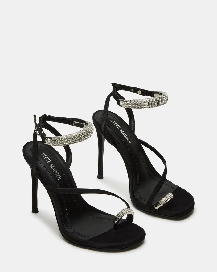 Setzen Sie ein stilvolles Statement mit dem Tia Rhinestones Black Satin Stiletto-High-Heel. Mit gewagten goldenen Metallakzenten und einem Riemchen-Design wertet dieser Schuh jedes Outfit auf.
