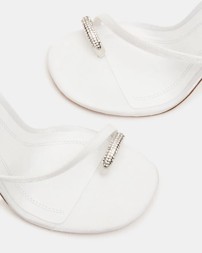 Setzen Sie ein stilvolles Statement mit dem Tia Rhinestones White Satin Stiletto-High-Heel. Mit gewagten goldenen Metallakzenten und einem Riemchen-Design wertet dieser Schuh jedes Outfit auf.