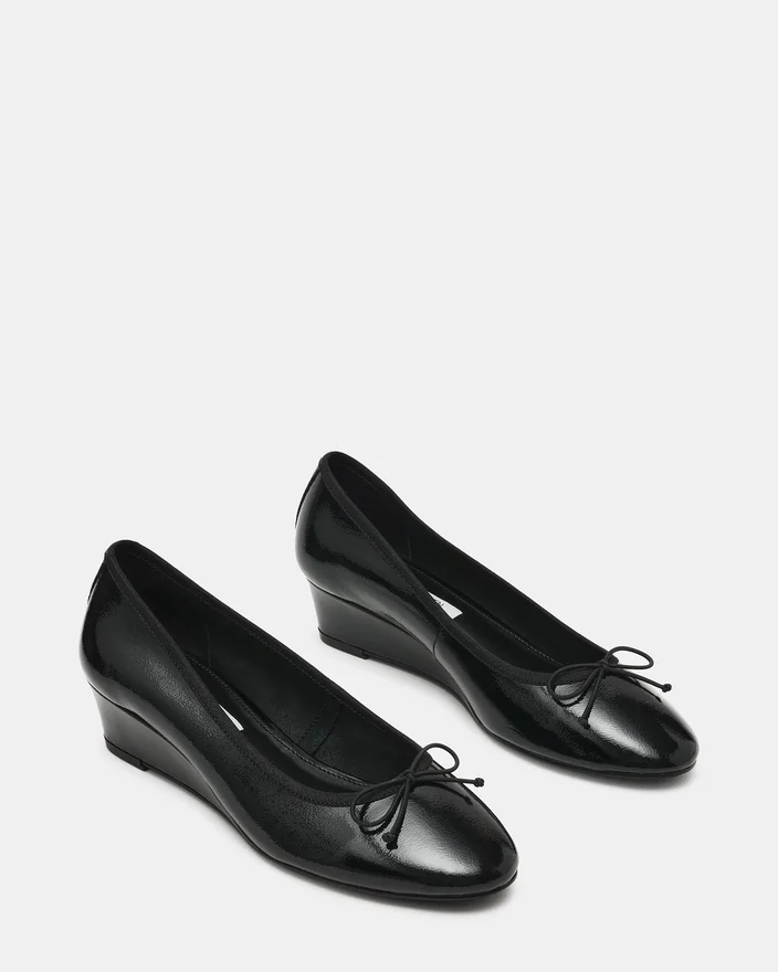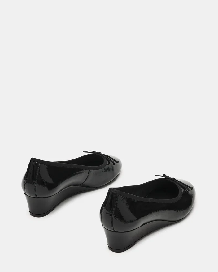 Der „Klutzy Black Patent Ballet Keilschuh“ vereint zeitlose Eleganz mit praktischem Tragekomfort und besticht durch ein elegantes Finish sowie eine raffinierte Silhouette mit runder Zehenpartie. Eine zarte Schleife am Vorderblatt verleiht dem Modell einen Hauch von Raffinesse und macht es sowohl für berufliche als auch für Freizeit-Anlässe vielseitig einsetzbar. Die Keilschuhe sorgen für stabilen Halt und ganztägigen Tragekomfort, ohne die anmutige Ästhetik eines klassischen, vom Ballett inspirierten Designs zu beeinträchtigen.