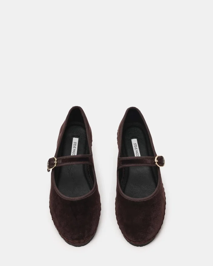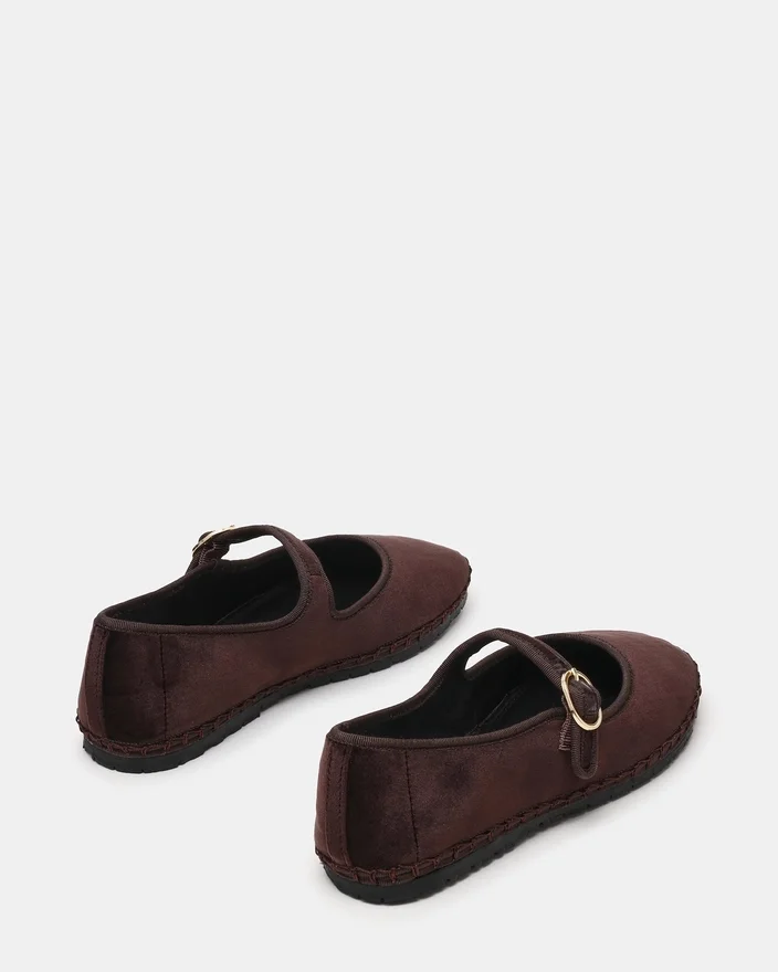 Der Velma Brown Velvet besticht durch eine zeitlose Mary-Jane-Silhouette, die durch einen sicheren Schnallenverschluss aufgewertet wird. Dieser flache Schuh bietet raffinierten Komfort für den ganzen Tag und verfügt über eine abgerundete Zehenpartie sowie ein klassisches Riemchen-Design, das sich mühelos mit jeder Garderobe kombinieren lässt. Das Schnallendetail verleiht dem Schuh einen Hauch von Eleganz und sorgt gleichzeitig für eine individuell anpassbare Passform. Perfekt für alle, die einen vielseitigen, eleganten Schuh suchen.