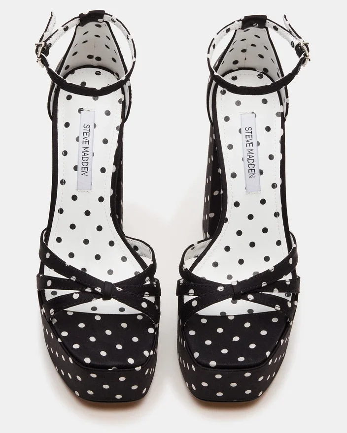 Der Retro White/Black Polka Dot besticht durch ein klassisches Plateauschuh-Design, kombiniert mit einem Blockabsatz für verbesserte Balance und Komfort. Die offene Zehenpartie sorgt für Atmungsaktivität und Stil, während der verstellbare Fesselriemen einen sicheren Sitz gewährleistet. Diese Kombination bietet sowohl mehr Höhe als auch dauerhaften Halt und macht ihn zum perfekten High Heel für alle, die einen raffinierten Look suchen.