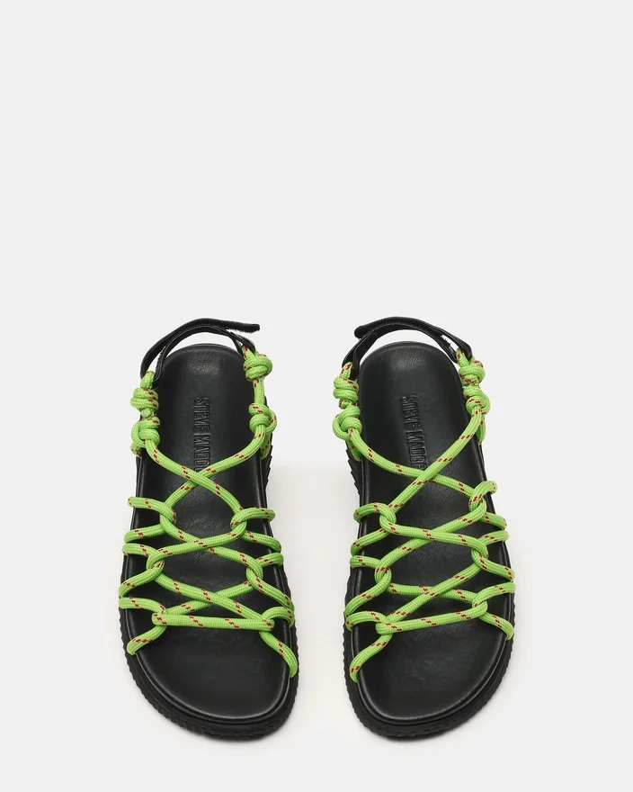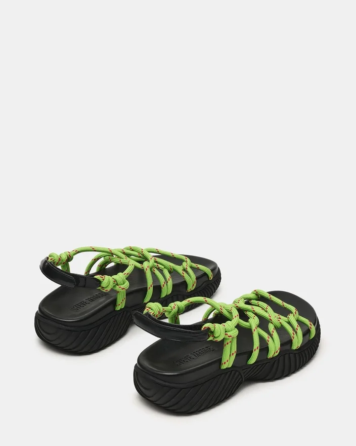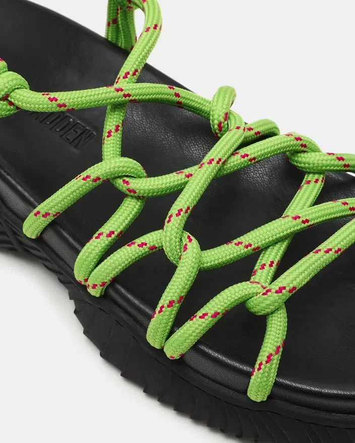 Diese Connie-Sandale in Neongrün besticht durch eine markante, klobige Sohle, die für Stabilität und Präsenz sorgt. Gewebte Seilriemen bieten eine authentische Textur und zuverlässigen Halt, während das gepolsterte Fußbett den ganzen Tag über anhaltenden Komfort gewährleistet. Die Sohlenkonstruktion sorgt sowohl für Langlebigkeit als auch für einen bodenständigen Look, was dieses Modell zur idealen Wahl für alle macht, die Komfort priorisieren, ohne dabei auf zeitgemäßes Design verzichten zu wollen.