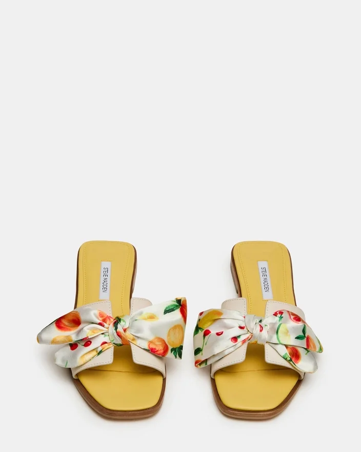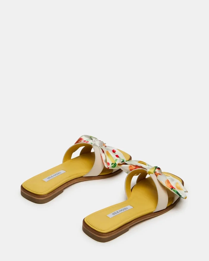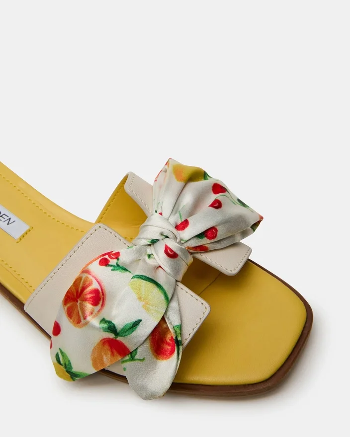 Geometrische Ausschnitte am breiten, einteiligen Riemen der Hadyn Citrus Multi Scarf Slide verleihen diesem flachen Sandalen-Design einen frischen Look.