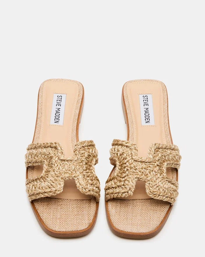 Geometrische Ausschnitte am breiten Einzelriemen der Hadyn-Slide verleihen diesem flachen Sandalen-Design einen frischen Look.