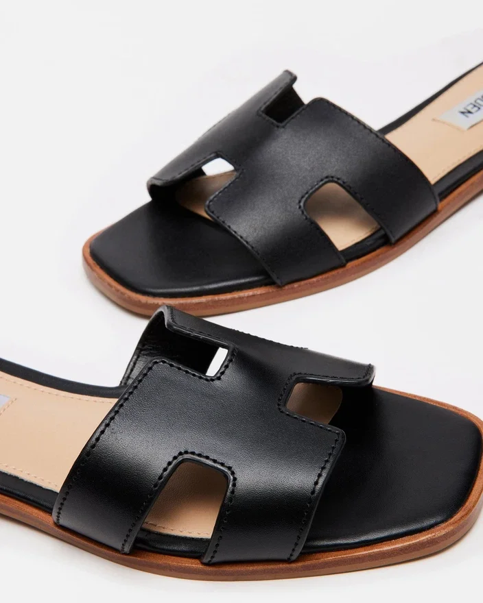 Geometrische Ausschnitte am breiten Einzelriemen der Hadyn-Slide verleihen diesem flachen Sandalen-Design einen frischen Look.