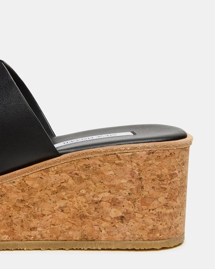 Die Harmony-Sandale aus schwarzem Leder verfügt über einen Kork-Platauschuh, der sowohl Stil als auch Komfort für den ganzen Tag bietet. Der strukturierte Keilschuh sorgt für stabilen Halt, ohne dabei an Eleganz einzubüßen. Eine vielseitige Wahl für den Übergang von Freizeitaktivitäten zu festlichen Anlässen.