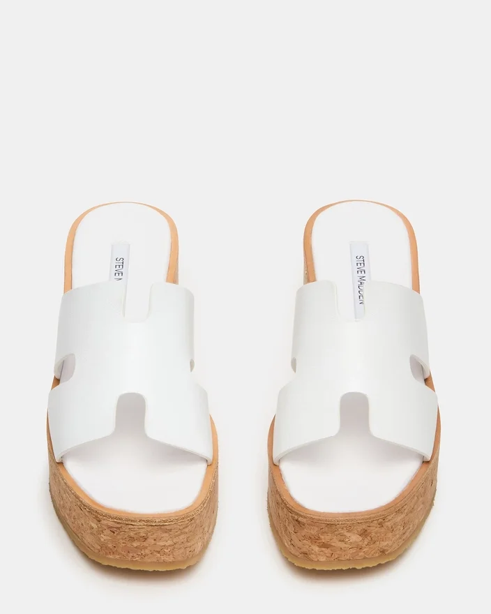 Die Harmony-Sandale aus weißem Leder verfügt über einen Kork-Platauschuh, der sowohl Stil als auch Komfort für den ganzen Tag bietet. Der strukturierte Keilschuh sorgt für stabilen Halt, ohne dabei an Eleganz einzubüßen. Eine vielseitige Wahl für den Übergang von Freizeit-Ausflügen zu festlichen Anlässen.