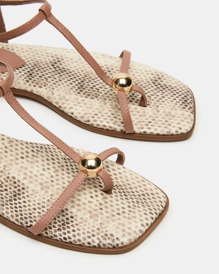 Verleihen Sie Ihrem Look das gewisse Etwas mit der Ritzy Natural Snake Sandale mit eckiger Zehenpartie und Riemchen, die gekonnt auf Stil und Komfort ausgelegt ist. Ihre moderne eckige Zehenpartie sorgt für einen raffinierten Touch, während zarte Riemchen einen sicheren Sitz gewährleisten. Diese Sandale eignet sich perfekt zum Aufpeppen oder Verleihen von Flair an Freizeitoutfits und verbindet zeitgemäßes Design mit vielseitiger Tragbarkeit.