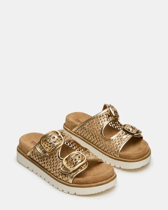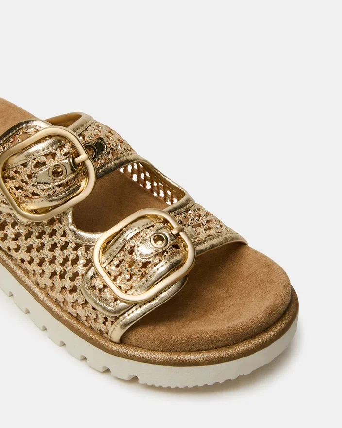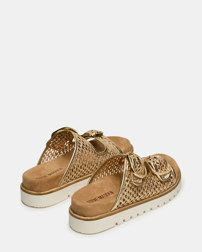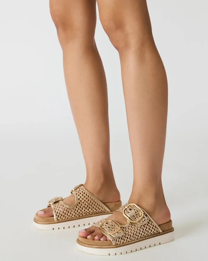 Die Shellby Gold ist eine meisterhaft gefertigte, gewebte Sandale, die für mühelosen Komfort und Stil entworfen wurde. Die Slide-Silhouette verfügt über sichere Schnallenverschlüsse, die den ganzen Tag über eine anpassbare Passform und Stabilität bieten. Ein konturiertes Fußbett sorgt für Fußgewölbestütze und Dämpfung, wodurch dieses vielseitige Modell ideal sowohl für Freizeitausflüge als auch für entspannte Anlässe ist. Die gewebte Konstruktion sorgt für atmungsaktiven Tragekomfort, perfekt für warmes Wetter.