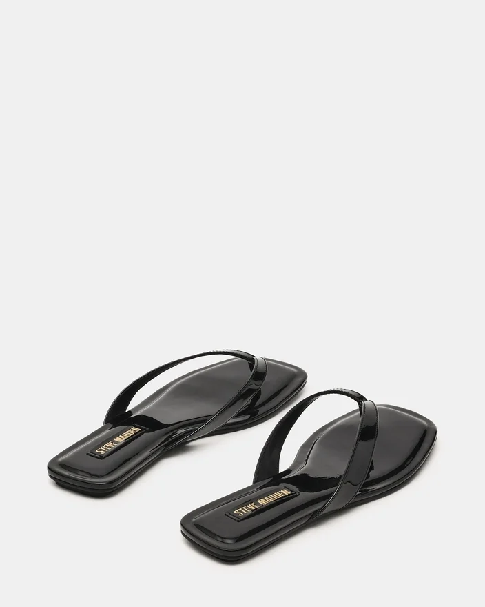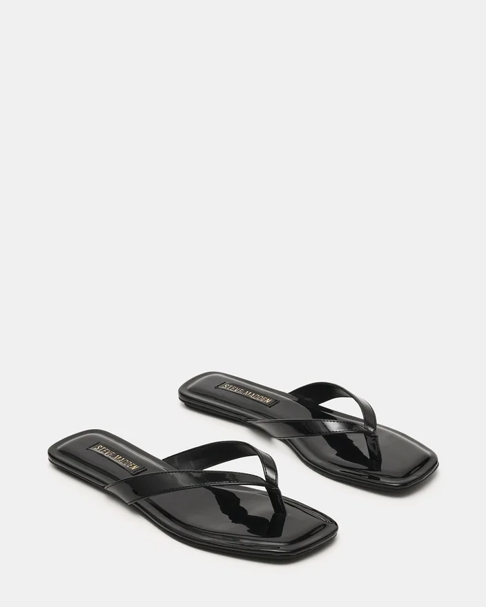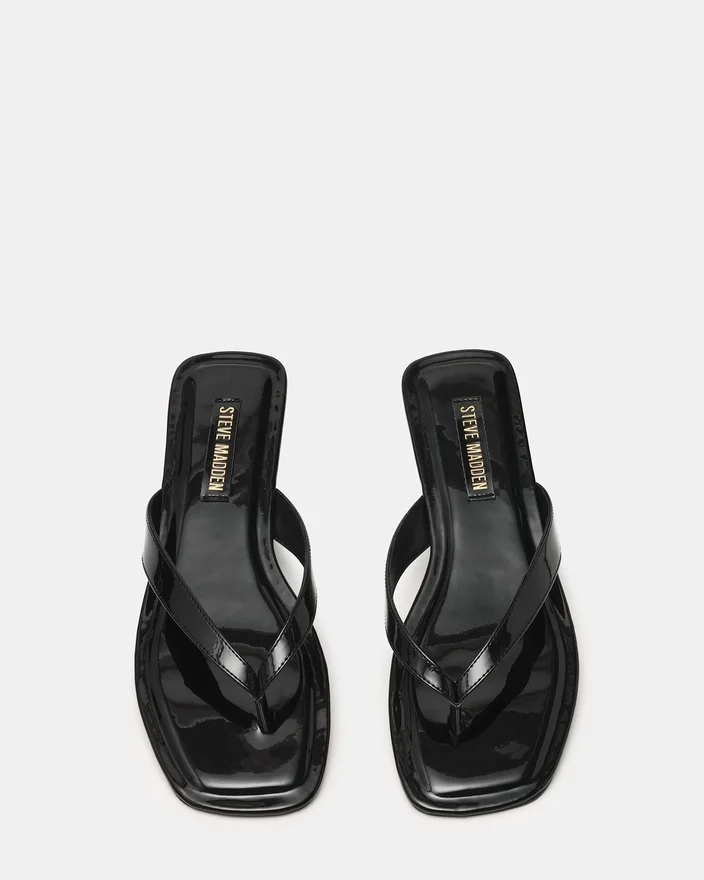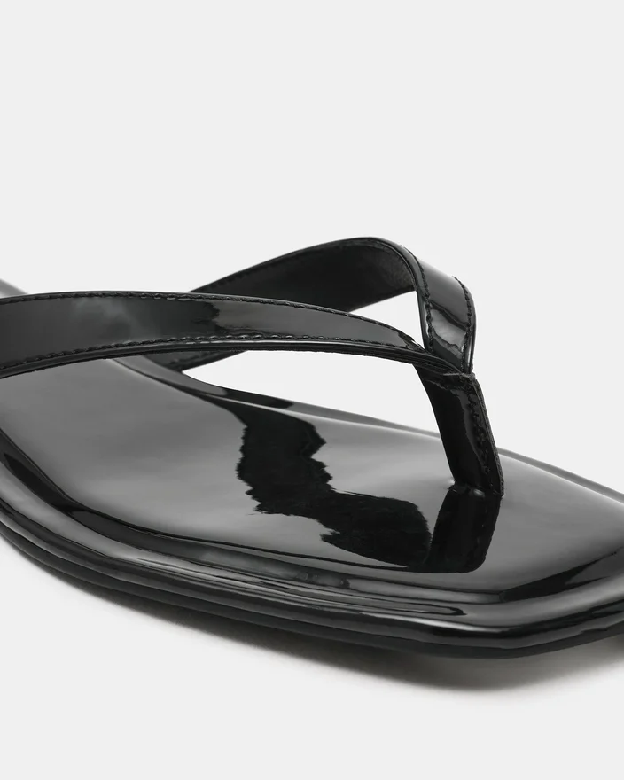 Die Trella Black Patent Sandale besticht durch ein modernes Design mit eckiger Zehenpartie, kombiniert mit einem minimalistischen Zehensteg, und bietet sowohl Stil als auch Komfort. Aus hochwertigen Materialien gefertigt, sorgt sie für einen raffinierten Look, der sich für verschiedene Anlässe eignet. Ihre schlanke Silhouette betont die Fußform und gewährleistet gleichzeitig einen sicheren Sitz, was sie zur ersten Wahl für alle macht, die bei Schuhwerk für warmes Wetter auf zurückhaltende Eleganz setzen.