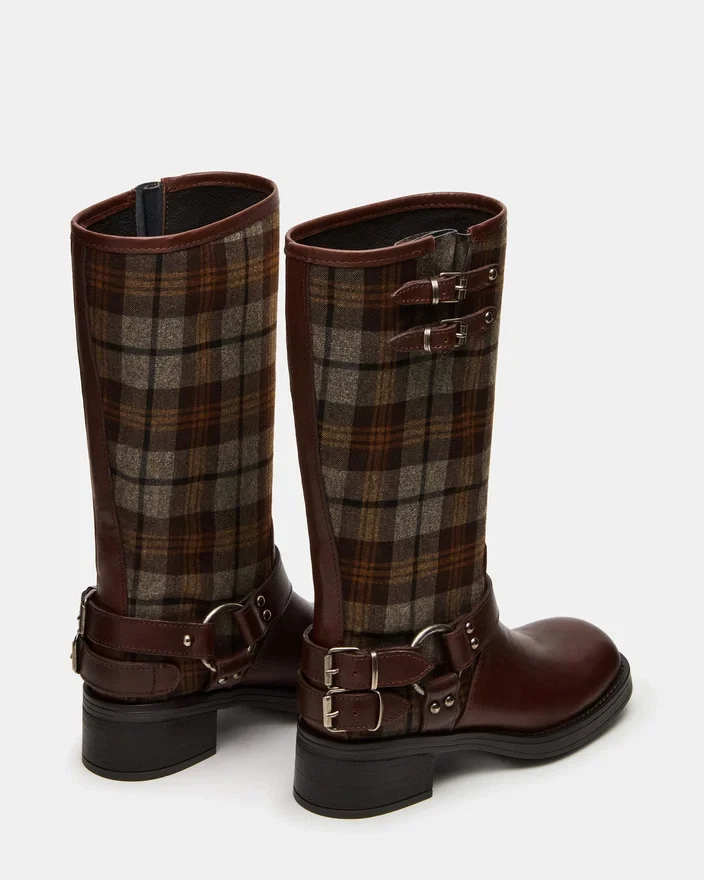 Der Astor Flannel Brown Multi Stiefel mit eckiger Zehenkappe verfügt über eine lockere, wadenhohe Silhouette, die durch Riemenakzente und markante Schnallen verstärkt wird. Eine breite Sohle mit Blockabsatz bildet eine solide Basis für dieses von Engineer-Stiefeln inspirierte Design.