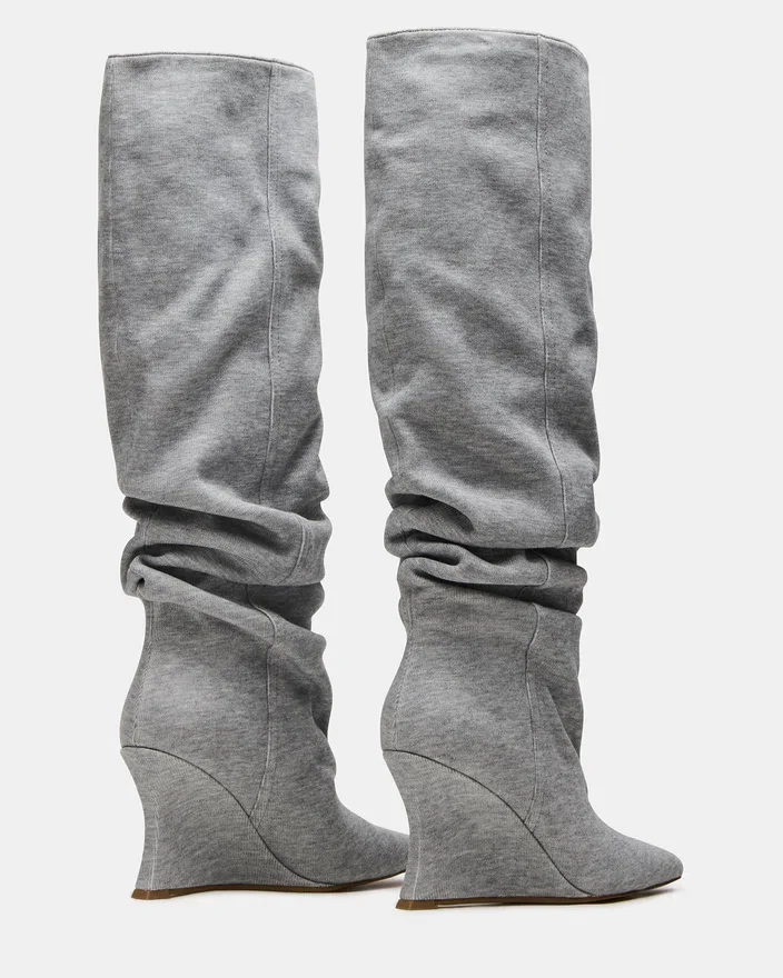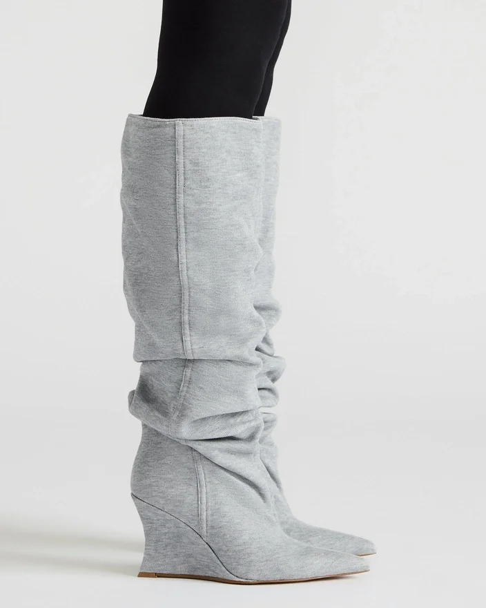 Der Distortion-Stiefel besticht durch ein gekräuseltes Design, einen Keilabsatz und eine spitze Zehenpartie, die bis zur Kniehöhe reicht und für eine markante, modische Silhouette sorgt. Dieser Stiefel wurde entwickelt, um kantigen Stil mit Tragekomfort zu verbinden, und wertet mit seinem eleganten Design und dem markanten Keilabsatz jedes Outfit auf. Ideal für alle, die ein Statement-Stück suchen, das Trend und Funktionalität vereint.