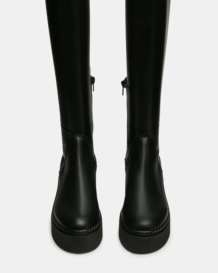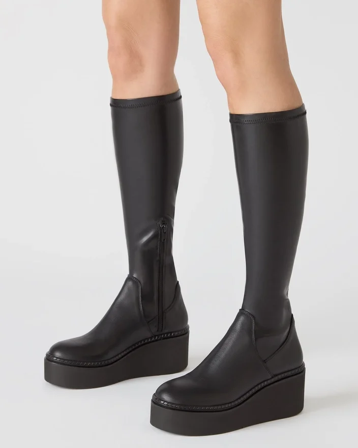 Dieser kniehohe Stiefel Draco Black verbindet architektonisches Design mit praktischer Funktionalität. Die abgerundete Zehenpartie sorgt für eine raffinierte Silhouette, während die Plateauschuhe für mehr Höhe und verbesserten Komfort bei längerem Tragen bieten. Mit präziser Handwerkskunst gefertigt, bietet er eine elegante Ästhetik und strukturellen Halt, der jede Garderobe aufwertet.