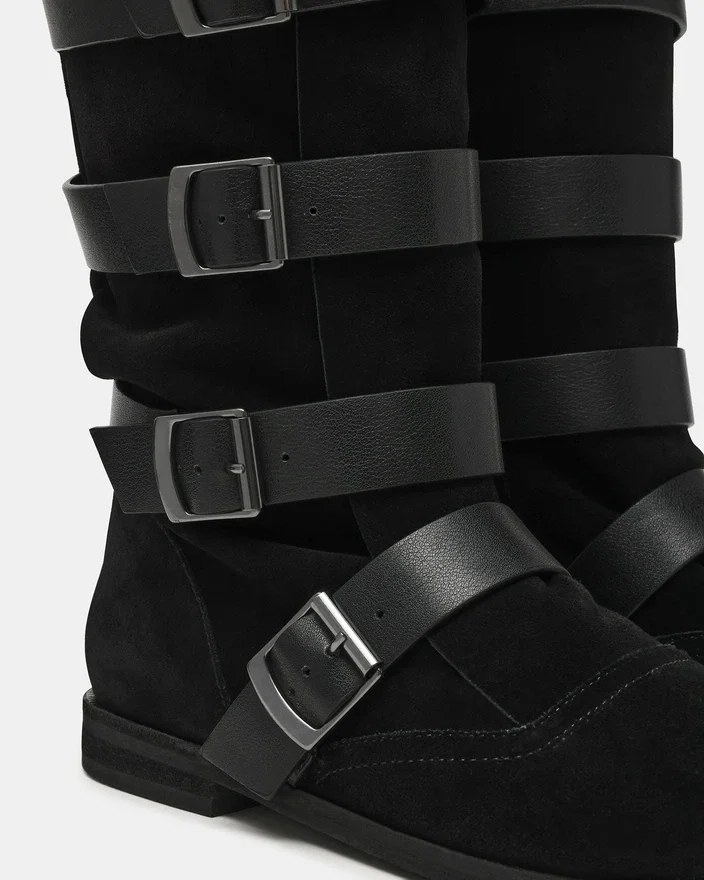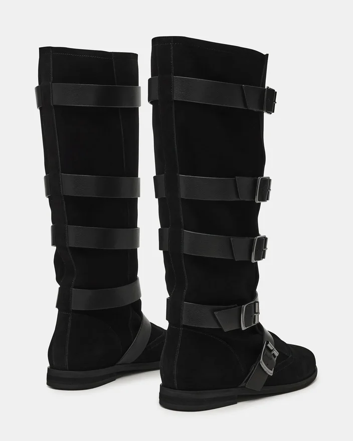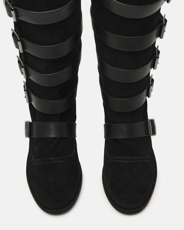Der Indio Black Suede Stiefel verkörpert mit seiner runden Zehenpartie und den Schnallenriemen zeitloses Design. Diese Riemen sorgen für einen einzigartigen Look und verleihen der Silhouette optische Tiefe. Dieser Stiefel reicht bis zur Kniehöhe und bietet so erweiterte Abdeckung sowie eine imposante Präsenz, die jedes Outfit aufwertet.