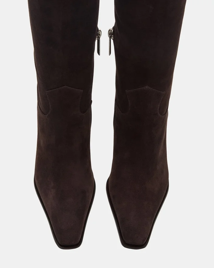 Erweitern Sie Ihre Schuhkollektion mit dem kniehohen Stiefel aus braunem Wildleder von Wescot, der sich durch eine moderne eckige Zehenpartie und einen raffinierten Absatz auszeichnet. Dieser aus hochwertigen Materialien gefertigte Stiefel bietet sowohl Stil als auch Struktur und eignet sich perfekt für elegante Looks, die Komfort und Selbstbewusstsein erfordern.