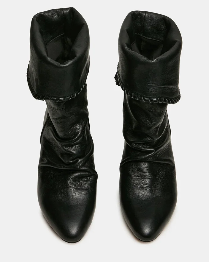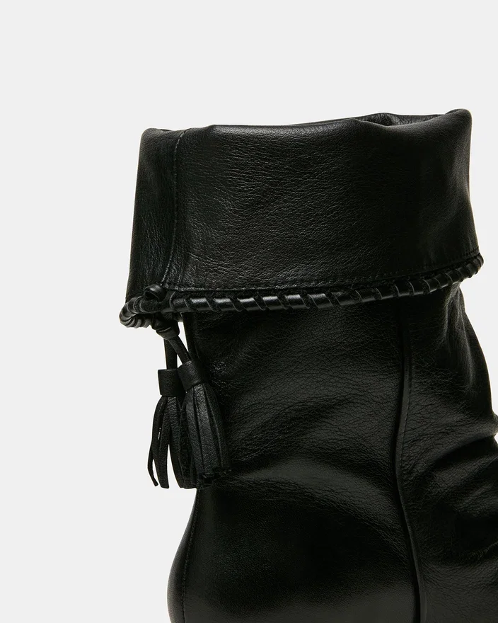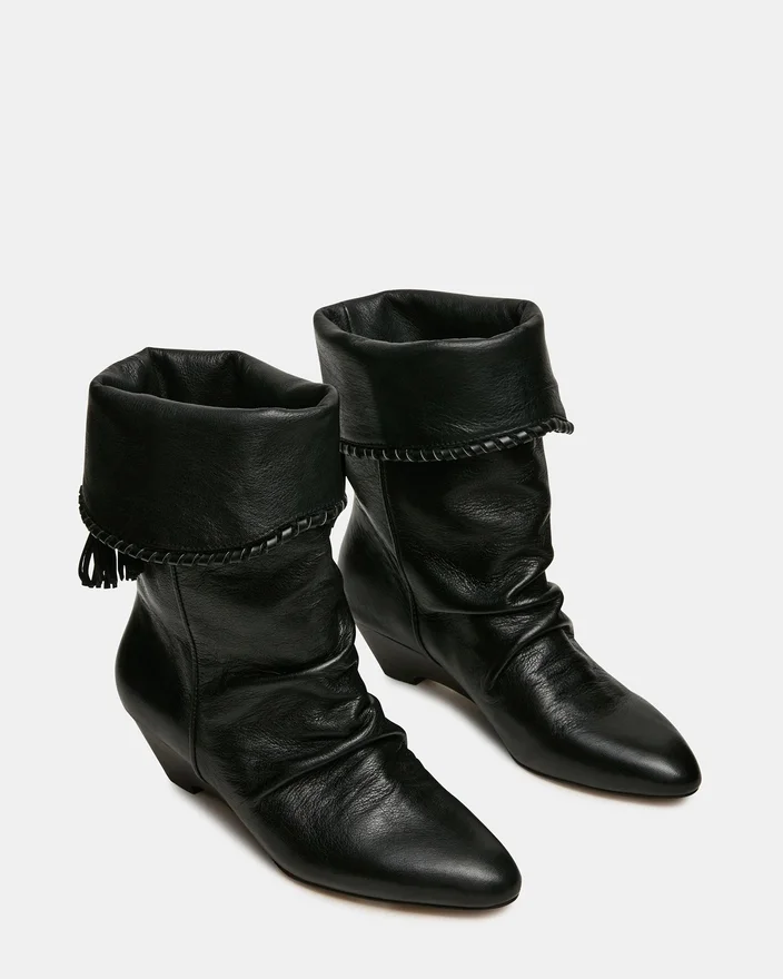 Die Enaya Stiefelette aus schwarzem Leder mit Keilschuh vereint architektonische Raffinesse mit edlen Details. Die spitze Zehenpartie verlängert optisch das Bein, während das geraffte Design für zusätzliche Struktur und optische Spannung sorgt. Die Quaste rundet das Design elegant ab und wertet jedes Outfit auf.