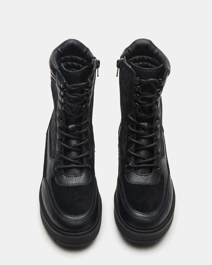 Der schwarze Schnür-Stiefel „Hiker“ mit Profilsohle vereint robuste Langlebigkeit mit modernem Stil. Mit einer stabilen Profilsohle für verbesserte Traktion und einem sicheren Schnürdesign bietet dieser Stiefel zuverlässigen Halt und Komfort für urbane Abenteuer oder Ausflüge in die Natur. Sein vielseitiges Design verleiht jedem Outfit eine raffinierte Note und sorgt gleichzeitig für lange Haltbarkeit. Ideal für alle, die Funktionalität und Mode in einem kompakten Stiefeletten suchen.