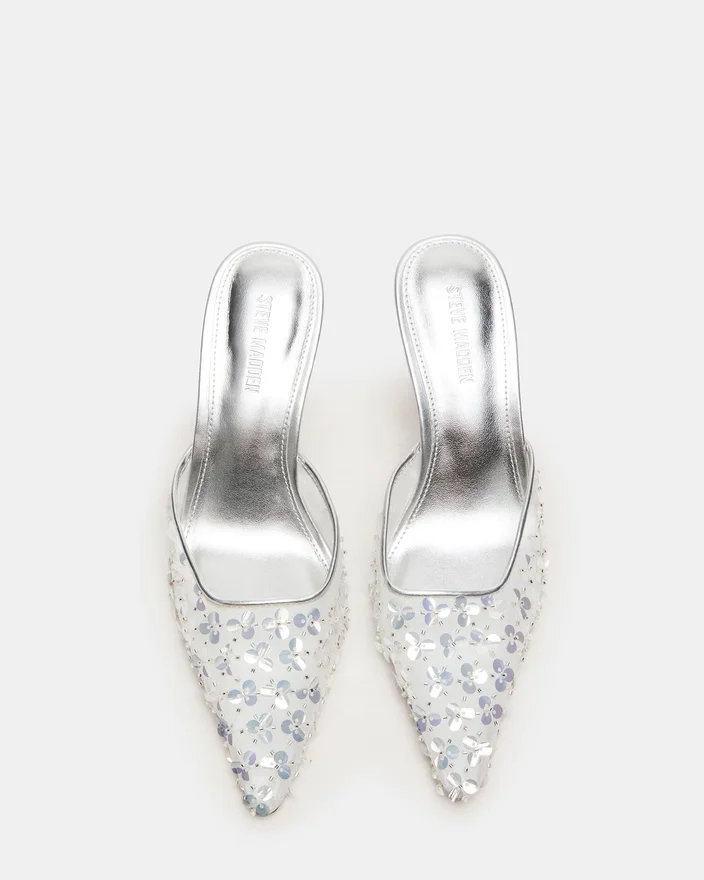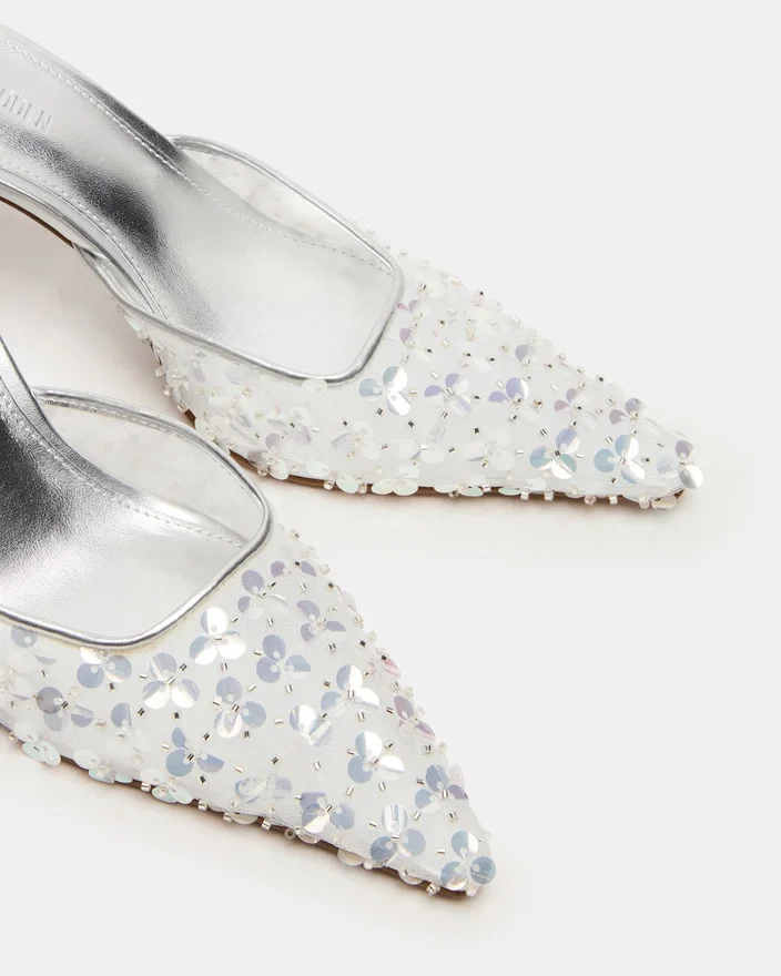 Bereichern Sie Ihre Schuhkollektion mit dem „Alexi Sequin Silver“, einem eleganten Pantolett-Modell mit spitzer Zehenpartie. Diese vielseitige Silhouette besticht durch hochwertige Details und verbindet modernen Stil mit bequemen Trageeigenschaften.